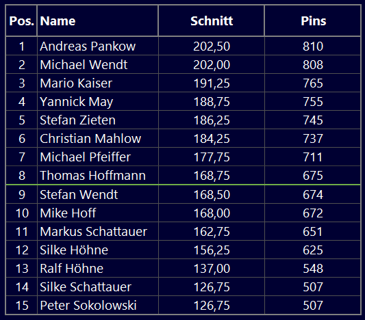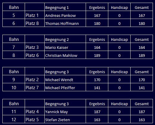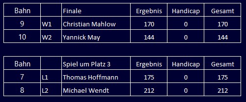 17.08.2025 – B1 Center SchöneicheFinale/Spiel um Platz 3HalbfinaleViertelfinaleVorrunde (4 Spiele, Damen 10 HDC pro Spiel)18.08.2024 – Berolina Bowling LoungeFinale/Spiel um Platz 3HalbfinaleViertelfinaleVorrunde (4 Spiele, Damen 10 HDC pro Spiel)11.03.2023 – Bowlero BowlingHauptrunde (6 Spiele, Damen 10 HDC pro Spiel)